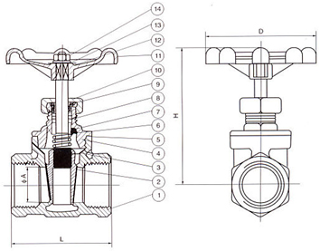 序號NO. 零件名稱 材質(zhì) 1 閥體 不銹鋼CF8M/CF8 2 閘板 不銹鋼CF8M/CF8 3 閥桿 不銹鋼SS316/304 4 閥蓋 不銹鋼CF8M/CF8 5 填料 聚四氟乙烯PTFE 6 止推墊片 不銹鋼SS304 7 閥桿架 不銹鋼SS316/SS304 8 填料 聚四氟乙烯PTFE 9 螺母 不銹鋼SS304 10 填料壓蓋螺母 不銹鋼SS316/SS304 11 手輪 鋁合金 12 鉻牌 鋁 13 手輪墊片 不銹鋼SS304 14 手輪螺母 不銹鋼SS304 主要連接尺寸及重量 單位:mm